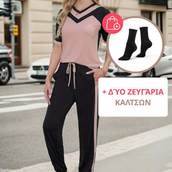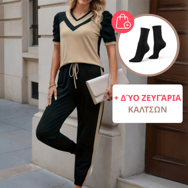 Μοντέρνο γυναικείο σετ δύο τεμαχίων με πολύχρωμο τοπ με κοντά φουσκωτά μανίκια και άνετο παντελόνι. Ιδανική επιλογή για καθημερινή χρήση ή για casual περιστάσεις.