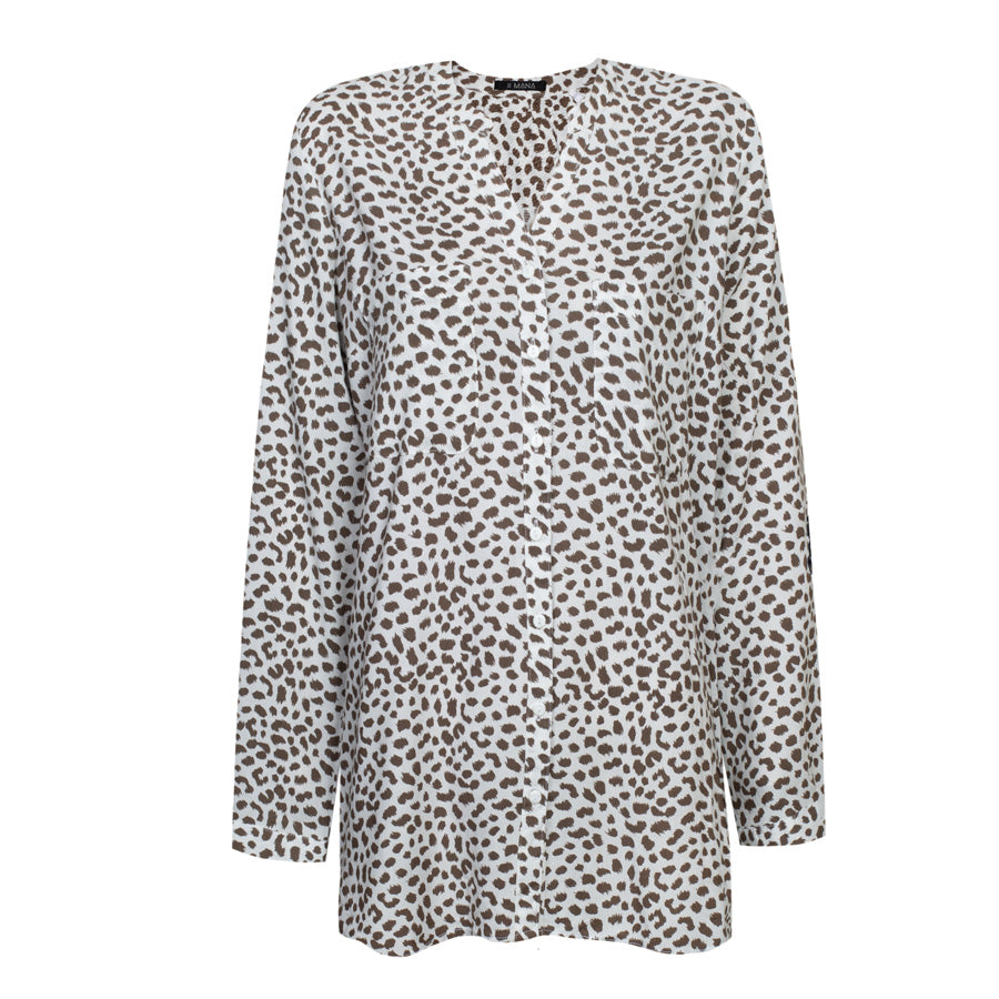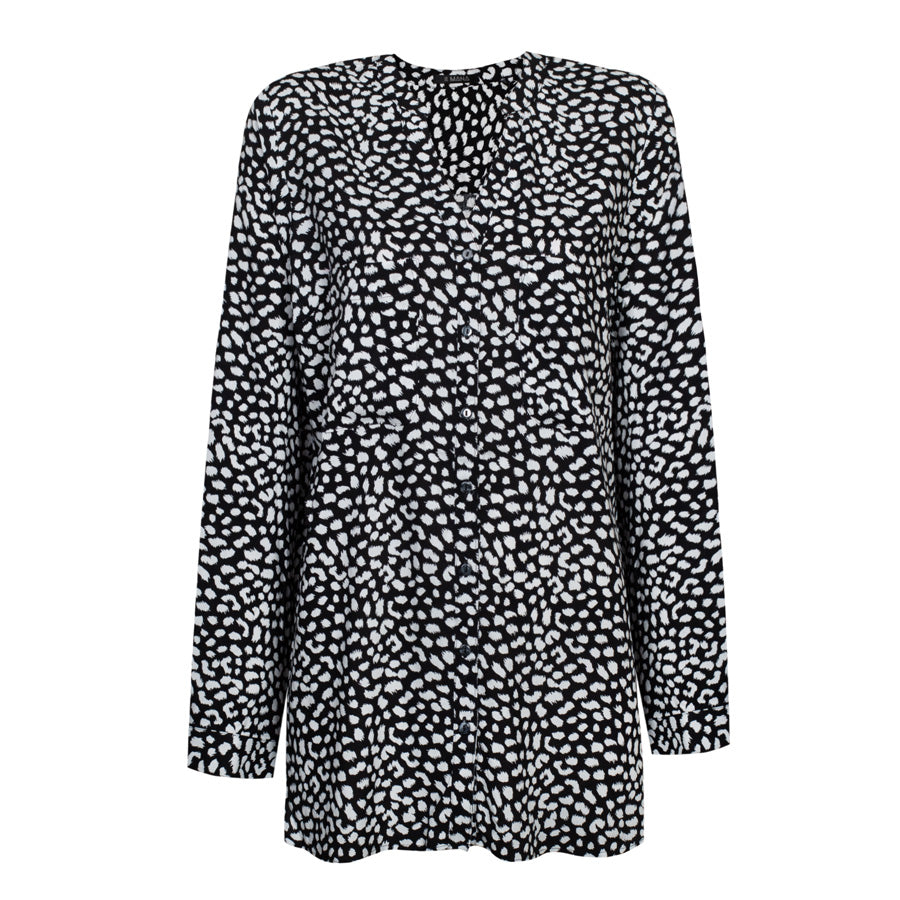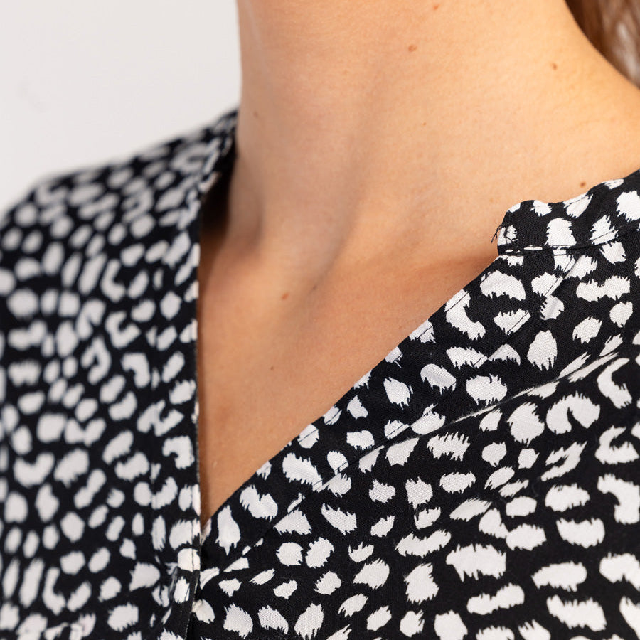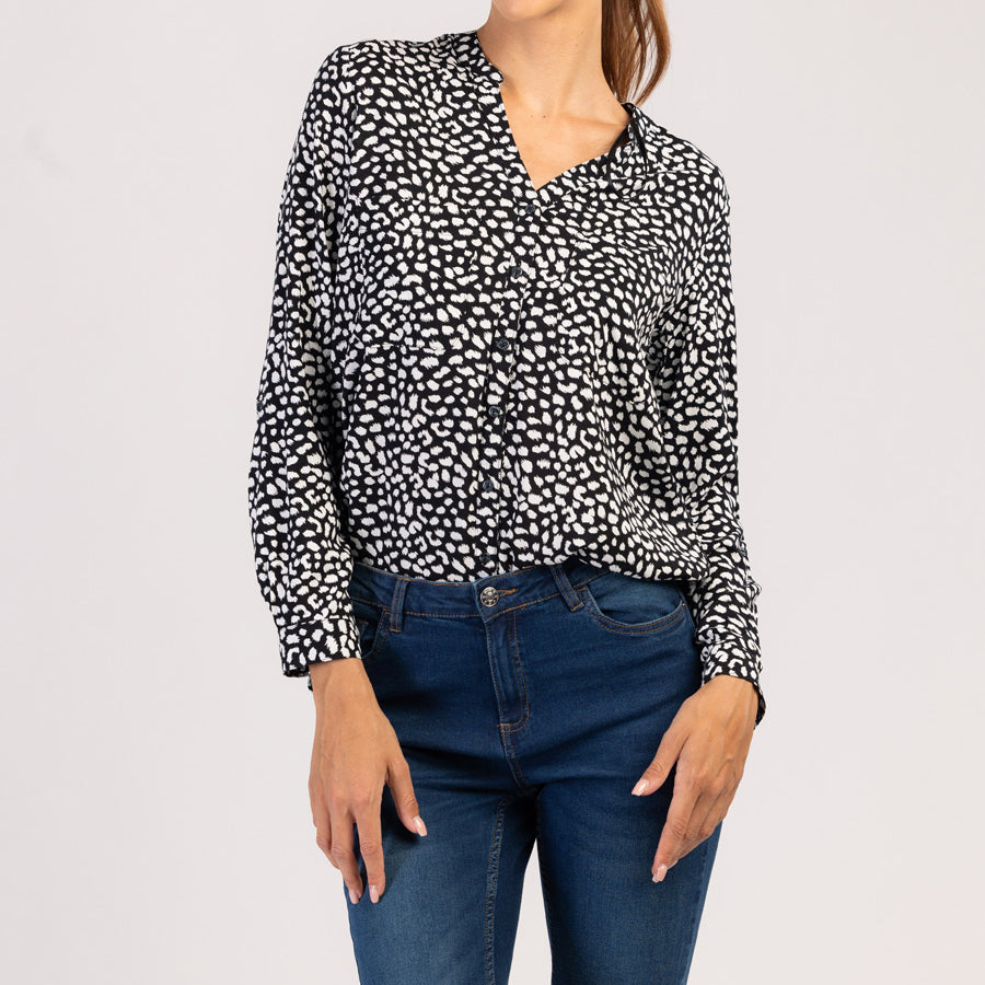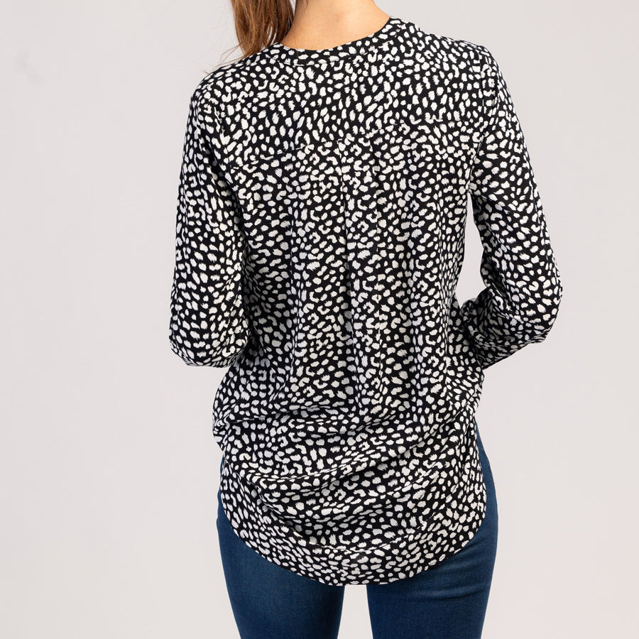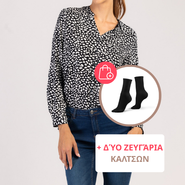 Αυτή η γυναικεία μπλούζα με μακριά μανίκια και εκλεπτυσμένο ασπρόμαυρο σχέδιο συνδυάζει κομψότητα και άνεση. Κατασκευασμένη από απαλή βισκόζη, εφαρμόζει όμορφα και αναπνέει, προσφέροντας μια άνετη αίσθηση όλη μέρα.